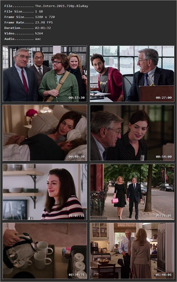 # Stars Cast: Robert De Niro as Ben Whitaker, Anne Hathaway as Jules Ostin, Rene Russo as Fiona Farwell, Anders Holm as Matt Ostin, JoJo Kushner as Paige Ostin, Andrew Rannells as Cameron, Adam Devine as Jason, Zack Pearlman as Davis, Jason Orley as Lewis, Christina Scherer as Becky, Nat Wolff as Justin, Linda Lavin as Patty, Celia Weston as Doris, Steve Vinovich as Miles, C.J. Wilson as Mike, Mary Kay Place as Jules's Mom, Erin Mackey as Jane, Christina Brucato as Emily, Wallis Currie-Wood as ATF Interviewer #1, Molly Bernard as ATF Interviewer #2, Paulina Singer as ATF Receptionist, Annie Funke as ATF Creative Team, Christine Evangelista as ATF Creative Team, Julee Cerda as ATF Creative Team, Peter Vack as ATF Creative Team, Nikki Granatell as ATF Creative Team, Liza Binkley as ATF Creative Team, Eshan Bay as ATF Tech Team, Caitlin Kinnunen as ATF Tech Team, Tristan Griffin as ATF Tech Team, Sydney Morton as Customer Service Rep, Brandon Tyler Harris as Customer Service Rep, Elena Shaddow as Customer Service Rep, Liz Holtan as Customer Service Rep, Claire Saunders as Mailroom Intern, G. Keith Alexander as Senior Intern, Susan Feldman as Couple in Elevator, Mark D. Sikes as Couple in Elevator, Drena De Niro as Hotel Manager, Max von Essen as Businessman at Starbucks, George Merrick as Businessman at Starbucks, Casey Benjamin as Mom at School, Ruby Motz as Child at School, Emma Angstadt as Maddie, Eliud Kauffman as Warehouse Foreman, Jenny Fellner as Barista, Sean Kleier as Bartender, Elliot Villar as Escalade Driver, Tiffany Chen Ming-Ying as Tai Chi Instructor, Nikki James as Tai Chi Class, Mayumi Miguel as Tai Chi Class, JoAnna Powell as Tai Chi Class, Dan Castiglione as Tai Chi Class, Edie Cowan as Tai Chi Class, Ronald Duncan as Tai Chi Class, Michael Mann as Tai Chi Class, Leasen Beth Almquist as Tai Chi Class, Leah O'Donnell as Tai Chi Class, William Ryall as Tai Chi Class, Djassi DaCosta Johnson as Tai Chi Class, Ashley Amber Haas as Tai Chi Class, Michael Gorman as Tai Chi Class, Katherine Argo as Tai Chi Class, Matt Wall as Tai Chi Class, Daniel A. Weiner as Tai Chi Class, Frazer Brown as Man on Bench, Doris McCarthy as Starbucks Lady (uncredited), Kerttu Veske as Young Intern (uncredited)